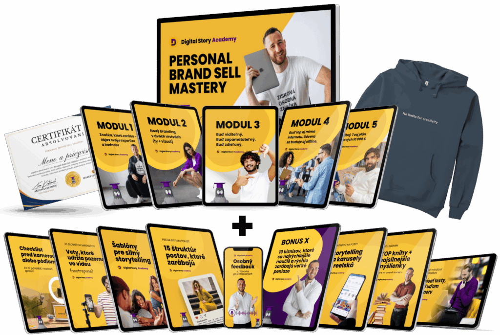 Získaš celý balík znalostí, nástrojov a bonusov, ktorý ti pomôže budovať osobnú značku, ktorá zarába. Všetko, čo potrebuješ – na jednom mieste.