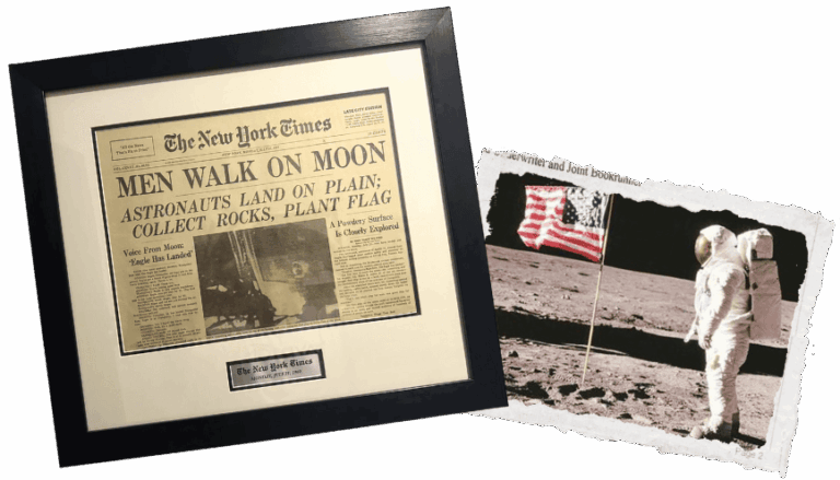 s originálnym výstrižkom z The New York Times – 21. júl 1969 (deň pristátia na Mesiaci) Každý kus je limitovaný masterpiece® – originál s unikátnym fragmentom novín.