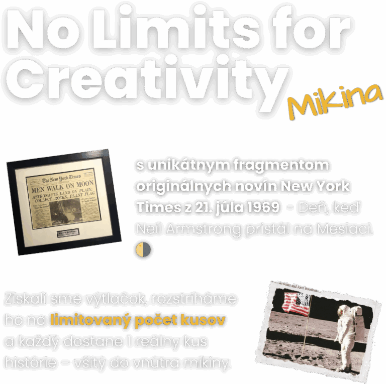 s doživotným prístupom a exkluzívnym merchom No Limits for Creativity s originálnym výstrižkom The New York Times z 21. júla 1969 (dňa, keď človek pristál na Mesiaci).