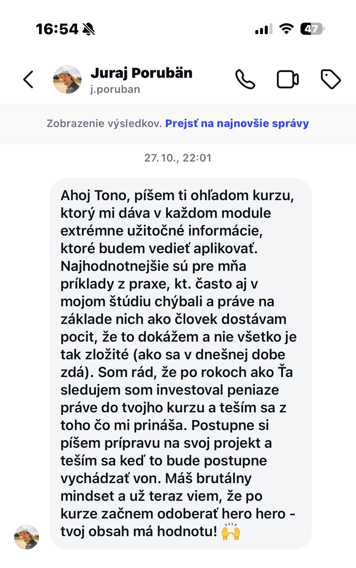 - Osobný feedback v hlasovke po 6 mesiacochPošleš mi číslo objednávky, tvoje výstupy, sociálne siete alebo iné materiály a ja ti nahovorím spätnú väzbu a odporúčania na ďalší rast