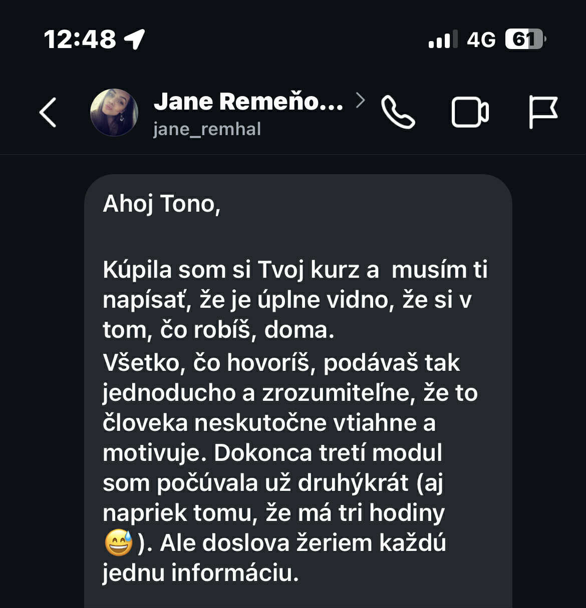 - Osobný feedback v hlasovke po 6 mesiacochPošleš mi číslo objednávky, tvoje výstupy, sociálne siete alebo iné materiály a ja ti nahovorím spätnú väzbu a odporúčania na ďalší rast