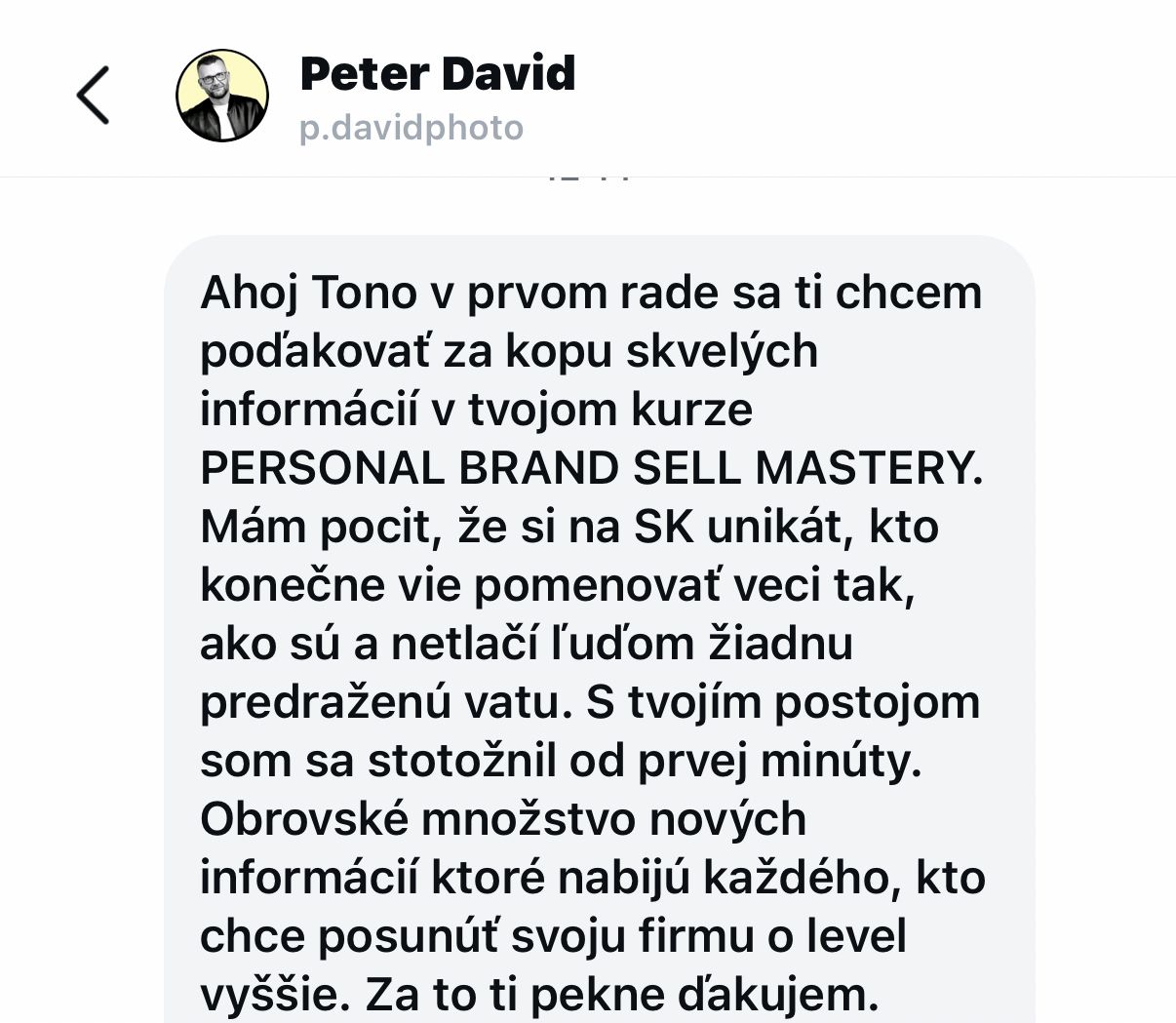 „Ľudia ma odhovárali, že načo sa ukazujem. Po troch mesiacoch budovania značky som vďaka Tonovemu know-how získal zákazku za 200 000 €. Dnes už viem, čo tým Tono myslel.“